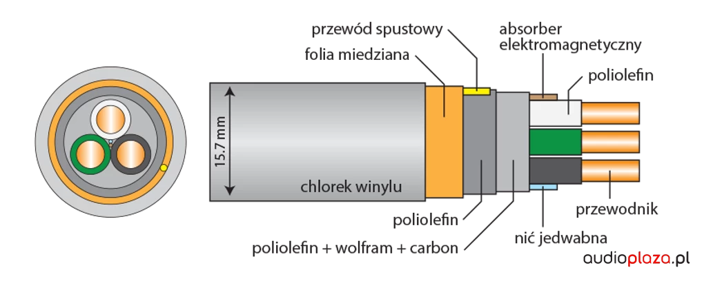 2 żyły z miedzi beztlenowej 7N D.U.C.C. Stressfree (średnica żyły 0,37 mm × 50 drucików) oraz przewód uziemiający z miękkiej miedzi beztlenowej 4N (0,37 mm × 50 drucików)