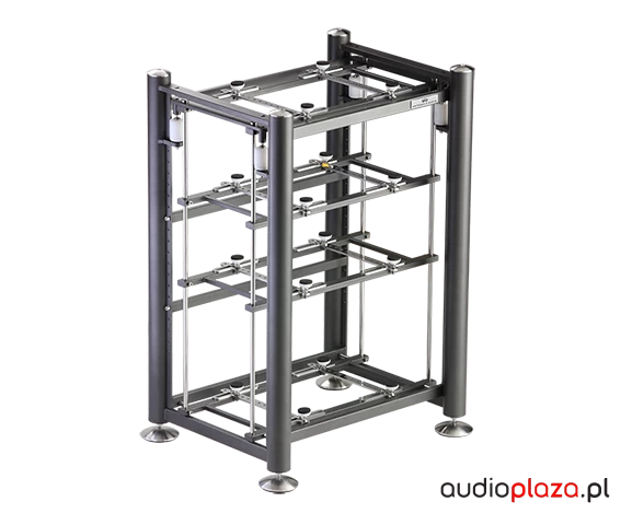 System regulowanych ram i ramion liniowych ze stali antymagnetycznej umożliwia swobodne pozycjonowanie urządzeń, a zastosowane kolce, dyski izolujące i podkładki tłumiące skutecznie minimalizują wpływ drgań na pracę elektroniki. Terminal uziemiający wspiera poprawne działanie gramofonów, a tylne pręty o regulowanej wysokości dodatkowo stabilizują całą konstrukcję. Stolik został wykończony trwałym, ciemnoszarym lakierem strukturalnym, co podkreśla jego solidność i elegancki charakter.
