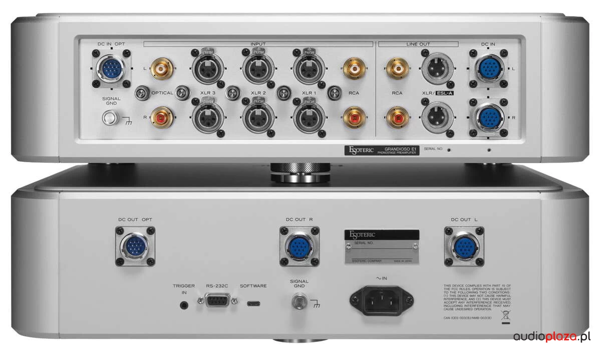 Jednym z najważniejszych elementów konstrukcji Grandioso E1 są trzy autorskie zbalansowane wejścia prądowe MC (XLR). W przeciwieństwie do tradycyjnych wejść napięciowych, które konwertują prąd generowany przez wkładkę na niewielki sygnał napięciowy, rozwiązanie Esoteric pozwala bezpośrednio wykorzystać energię prądową generowaną przez wkładkę MC. Dzięki temu możliwe jest zachowanie pełnej dynamiki i naturalnej charakterystyki brzmienia, bez strat wynikających z konwersji sygnału oraz niedopasowania impedancji.
